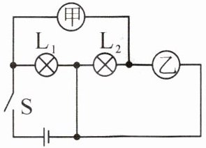 10. 在如图所示的电路中,已知电源电压是8 V,若在甲、乙两处分别接入电表,当开关S闭合后,两灯均能正常发光,通过$L_1、$$L_2$的电流分别是1 A、2 A,则甲表是