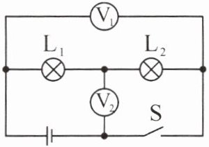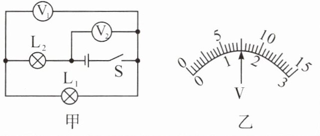 练习1-2 如图甲所示,闭合开关S后,灯$L_{1}和L_{2}$均发光,此时电压表$V_{1}和V_{2}$的指针偏转角度相同,位置如图乙所示,则灯$L_{1}和L_{2}$两端的电压分别是(