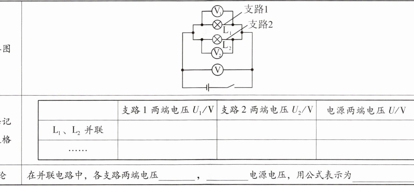 | 数据记录表格 | | 支路1两端电压$U_{1}$/V | 支路2两端电压$U_{2}$/V | 电源两端电压$U$/V |
