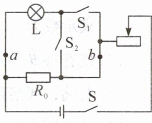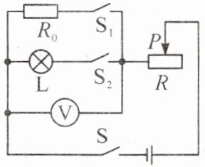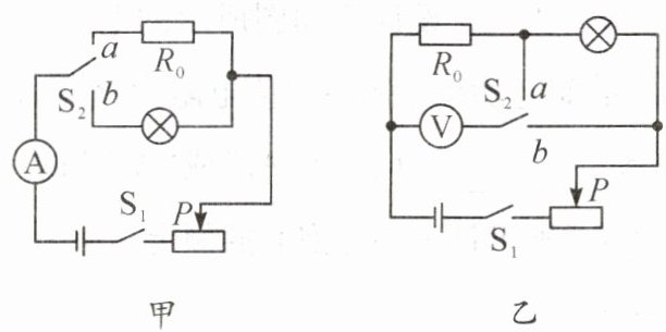 乙图中,$S_1$闭合,$S_2$接a时,电压表测$R_0$两端电压$U_0$;$S_2$接b时,电压表测小灯泡两端电压$U_L$。