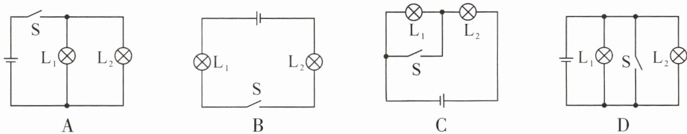 C选项:开关与L₁并联,闭合后L₁被短路,只有L₂发光。
