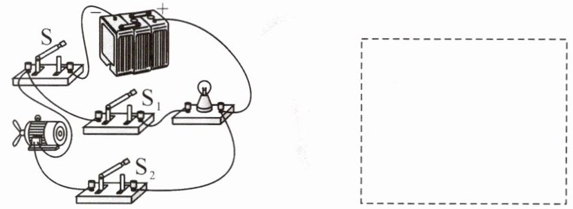 注:由于文本限制,上述为电路图的文本表示形式。标准电路图应使用规范电路符号,电源正极出发经总开关S后分为两支路:一支经S₁与灯泡串联,另一支经S₂与电动机串联,两支路并联后共同回到电源负极。
