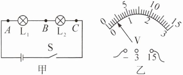 接入电路。(2)在寻找“串联电路的电压关系”时,将电压表并联在$L_1$两端,闭合开关,电压表示数如图乙所示,为了使实验结果更准确,接下来应该