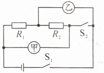 当开关$S_1$闭合、$S_2$断开,甲、乙两表均为电流表时,$R_1$与$R_2$并联。