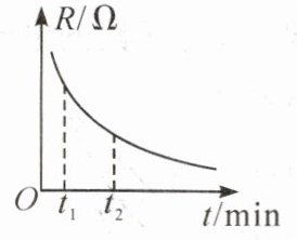 6. 一位同学研究导体的电阻与温度的关系时,通过使镍铬合金线降温,在不同时刻测量了一段镍铬合金线的电阻。其电阻-时间图像如图所示,与$t_2$时刻相比$,t_1$时刻的温度较高,电阻较