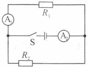 由电路图可知,电阻$R_1$与$R_2$并联,电流表$A_1$测通过$R_1$的电流$I_1$,电流表$A_2$测干路电流$I$。