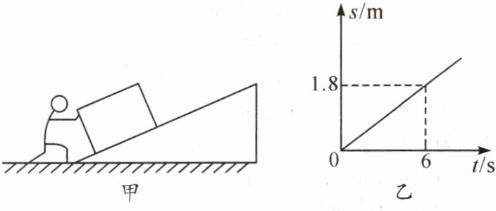 3. 小明参加社区志愿服务,利用斜面将箱子匀速推到车上,如图甲所示。已知斜面高1.2 m,长3 m,箱子的重力为300 N,小明施加的沿斜面向上的推力是200 N,箱子沿斜面向上运动的s-t图像如图乙所示,求: