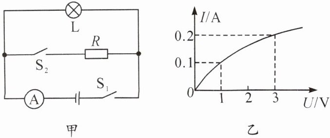 14.如图甲所示的电路中,定值电阻R的阻值为10 Ω,小灯泡的电流随其两端电压变化关系的图像如图乙所示。只闭合开关$ S_{1} $,小灯泡的实际功率为0.6 W,此时灯泡的电阻为