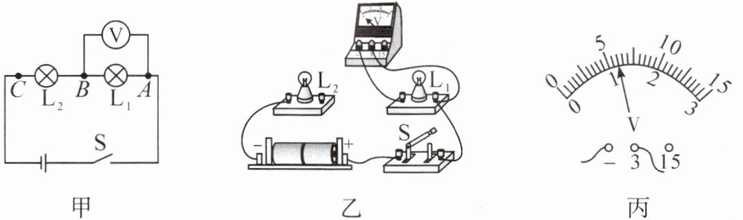 (3)用电压表分别测出电压U_{AB}、U_{BC}和U_{AC}。其中测U_{AB}时,电压表的示数如图丙所示,示数为