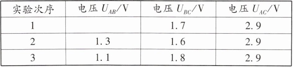V。接着更换不同规格的灯泡并多次实验,数据记录见表。| 实验次数 | 电压U_{AB}/V | 电压U_{BC}/V | 电压U_{AC}/V |