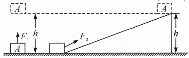 5.如图所示,小明用不同的力$F_1、$$F_2$在相同时间内分别把物体A直接匀速提升高度h和沿粗糙斜面匀速拉升高度h。$F_1$做功为$W_1,$功率为$P_1;F_2$做功为$W_2,$功率为$P_2。$则(