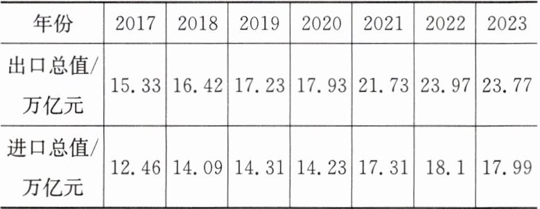 9. 随着对外开放程度不断扩大,我国对外贸易迅速发展。下表是我国 2017—2023 年的货物贸易进出口总值数据,请选择适当的统计图描述这两组数据,并对它们进行比较。