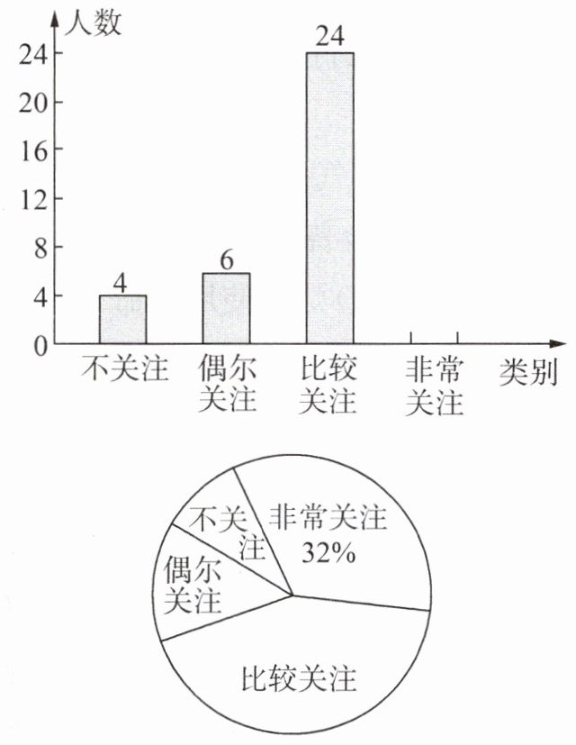 (1)“不关注”“偶尔关注”“比较关注”的学生一共有4 + 6 + 24 = 34(人),占调查人数的1 - 32% = 68%,所以此次调查中接受调查的学生人数为34÷68% = 50(人)。