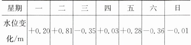 (2)根据题意,得0.20+0.81+(-0.35)+0.03+0.28+(-0.36)+(-0.01)=0.6(m)。0.6>0。因此,与上周末相比,本周末该河流的水位上升了。