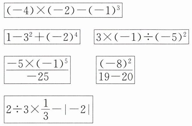解$:(-4)×(-2)-(-1)^{3}=(-4)×(-2)+1=8+1=9。$$1-3^{2}+(-2)^{4}=1-9+16=8。$$3×(-1)÷(-5)^{2}=3×(-1)÷25=(-3)÷25=-\frac{3}{25}。$$\frac{-5×(-1)^{5}}{-25}=\frac{-5×(-1)}{-25}=-\frac{1}{5}。$$\frac{(-8)^{2}}{19-20}=\frac{64}{19-20}=\frac{64}{-1}=-64。$$2÷3×\frac{1}{3}-$|-2|$=2×\frac{1}{3}×\frac{1}{3}-2=\frac{2}{9}-2=-\frac{16}{9}。$因此,正数有2个,负数有4个,即男同学有2名,女同学有4名。