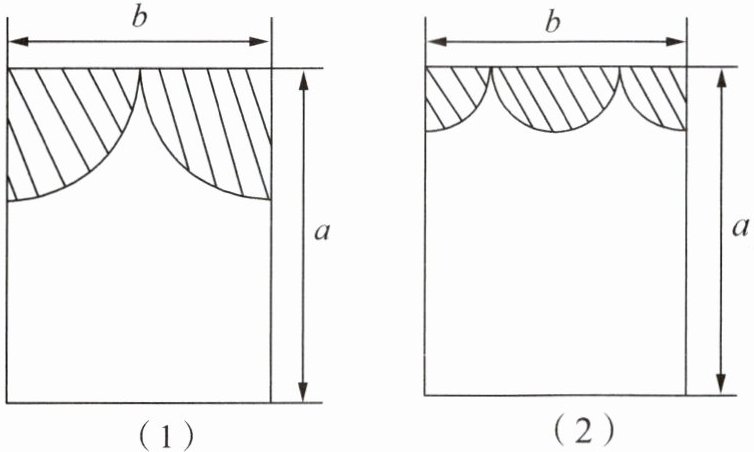 ;(结果保留$\pi$,窗框面积忽略不计)(2)小亮又设计了如图(2)所示的装饰物(由一个半圆和两个四分之一圆组成,它们的半径相同),此时窗户中能射进阳光的部分的面积是否更大?如果更大,大了多少?提示:$(\dfrac{a}{2})^{2} = \dfrac{a^{2}}{4}$,$(\dfrac{b}{2})^{2} = \dfrac{b^{2}}{4}$。
