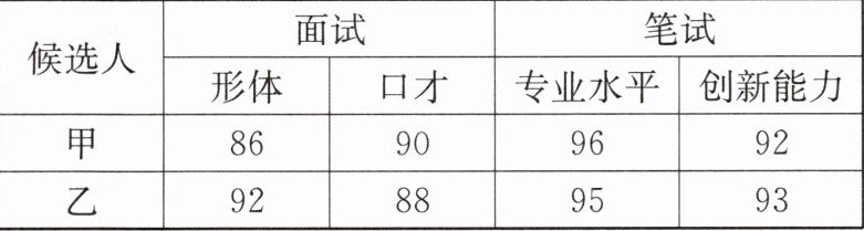 (2)若公司根据经营性质和岗位要求认为:形体、口才、专业水平、创新能力按照1:3:4:2的比例计算甲、乙两人各自的平均成绩,则谁将被录取?