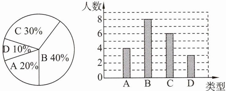 8. 某校 300 名学生参加植树活动,要求每人植 4~7 棵,活动结束后随机抽查 20 名学生每人的植树量,并分为四种类型,A:4 棵;B:5 棵;C:6 棵;D:7 棵,将各类人数绘制成扇形统计图和条形统计图(如图所示). 经确认,扇形统计图是正确的,而条形统计图有一处错误. 请根据以上信息回答下列问题:
