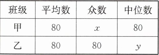 (3)甲班15名学生的测试成绩中85出现的次数最多,故x=85;把乙班学生的测试成绩按从小到大的顺序排列为:67,73,76,78,79,80,80,80,80,82,83,83,84,86,89,处在中间位置的数为80,故y=80.