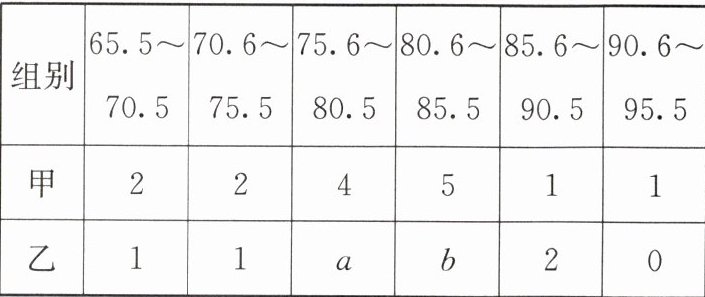 (1)乙班75.6~80.5分数段的学生数为7,80.6~85.5分数段的学生数为4,故a=7,b=4.