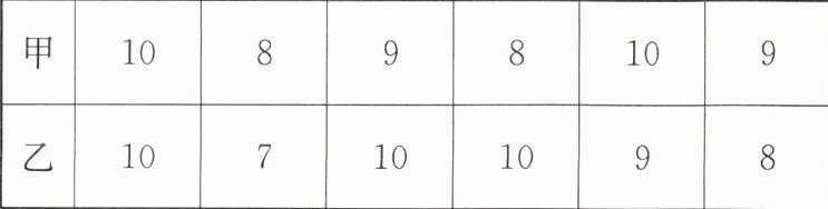(2)甲的方差$=\frac{1}{6}[(10-9)^{2}+(8-9)^{2}+(9-9)^{2}+(8-9)^{2}+(10-9)^{2}+(9-9)^{2}]= \frac{2}{3}$,