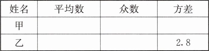 (1)甲的平均数$=\frac{6+7+8+7+7}{5}=7$,方差$=\frac{1}{5}[(6-7)^{2}+(7-7)^{2}+(8-7)^{2}+(7-7)^{2}+(7-7)^{2}]=0.4$,众数是7.乙的平均数$=\frac{3+6+6+7+8}{5}=6$,众数是6.补全表格如下表: