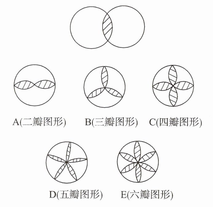例4 将两个大小相等的圆部分重合,其中重叠的部分(图中的阴影部分)我们称之为一个“花瓣”,由“花瓣”及圆组成的图形称为花瓣图形. 下面是一些由“花瓣”和圆组成的图形.