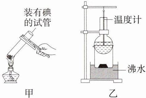 7. 新课标科学探究 [2025 吉林长春绿园期中,★☆]某小组同学在做固体碘升华实验时,甲同学直接将试管放在酒精灯火焰上,如图甲所示。乙同学将盛有碘的烧杯浸入热水槽中,烧瓶中装入适量的水,调整好温度计的位置,放置在烧杯口处,如图乙所示。上网查阅得知:碘的熔点约是 114℃、沸点约是 184℃;1 个标准大气压下水的沸点是 100℃。
