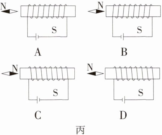 (4)为了研究通电螺线管的磁极性质,同学们一起对螺线管的电流方向和绕线方式进行了实验,得到了如图丙所示的四种情况。实验说明通电螺线管的磁极极性只与______有关。
