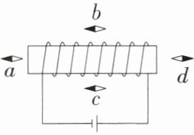 D 根据电源正、负极可知电流从通电螺线管的右侧背面流入、左侧正面流出,利用安培定则可以判断出通电螺线管的左端为S极,右端为N极;因为磁体周围的磁感线从N极出发,回到S极,磁场中任意一点小磁针N极的指向和该点的磁场方向一致,所以a点小磁针N极指向右,b点小磁针N极指向左;c点小磁针N极指向左;d点小磁针N极指向右,故A、B、C错误,D正确。