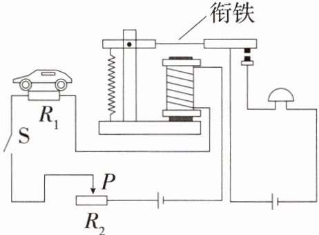 5.跨学科日常生活「2025福建福州十九中期末改编」(多选)如图是某道路限载报警器的工作原理图。电源电压不变,$R_{1}$是压敏电阻,其阻值随压力的变化而变化。闭合开关S,当车的质量超过限载质量时,电磁铁吸下衔铁,电铃响。根据不同的路面可以改变滑动变阻器滑片P的位置,来设定不同的限载质量。下列说法中正确的是 ( )