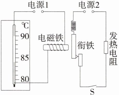(1)由题图可知,金属丝下端所指的刻度为$80^{\circ}C$,当温度没有升高到$80^{\circ}C$时,电磁铁无磁性,衔铁在弹簧的作用下被拉起,此时发热电阻工作;当温度达到$80^{\circ}C$时,水银柱与上方金属丝连通,使左侧电路连通,电磁铁有磁性,吸引衔铁,此时发热电阻停止工作。