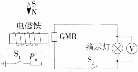 选项D:当滑片P向右滑动时,滑动变阻器接入电路的电阻变大,根据欧姆定律,电路中的电流会变小,电磁铁的磁性减弱。由于巨磁电阻的阻值随磁场的减弱而增大,所以巨磁电阻的阻值会增大。根据串联电路的分压原理,巨磁电阻两端的电压会增大,而电源电压不变,所以指示灯两端的电压会减小,即电压表的示数减小,所以D选项正确。