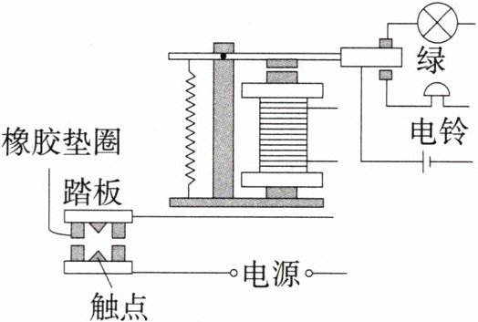 解析 当有人踩踏板时,控制电路闭合,电磁铁通电,具有磁性,将衔铁吸引下来,电铃发出警报;当无人踩踏板时,控制电路断开,电磁铁不工作,衔铁被弹簧拉起,灯泡接入电路发光,如图所示。