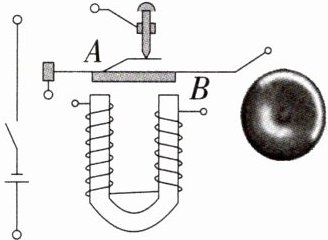 6. 如图是直流电铃的原理图。衔铁 B 与弹性片 A 相连,自然情况下弹性片是和螺钉接触的。接通电源后电磁铁吸引衔铁,敲击铃碗发声,但同时弹性片与螺钉分离导致断电,电磁铁失去磁性后弹性片又和螺钉接触而通电,如此往复。请在图中用笔画线代替导线,将直流电铃的工作电路连接完整,闭合开关后,电路能按上述原理工作。