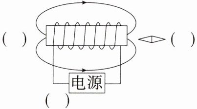 4. [2024 四川内江中考]如图,小磁针静止在通电螺线管右侧,请根据图中磁感线的方向,在螺线管左端和小磁针右端的括号内标出极性(“N”或“S”),在电源左边的括号内标出极性(“+”或“-”)。