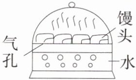 9.「2025 辽宁铁岭月考」在我国北方,馒头是人们日常主食之一。如图所示,蒸馒头时,加热使水汽化,产生高温水蒸气。水蒸气接触到馒头时____(填物态变化名称),同时____(选填“吸收”或“放出”)大量的热,从而将馒头蒸熟。