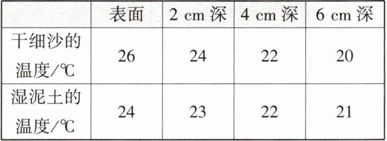 D 由表中数据分析可知,干细沙和湿泥土均呈现表面温度高,深度越大,温度越低的特点,故A、C正确;干细沙的表面温度为$26^{\circ }C$,深度每增加2 cm,温度就下降$2^{\circ }C$,而湿泥土的表面温度为$24^{\circ }C$,深度每增加2 cm,温度就下降$1^{\circ }C$,所以随着深度增大,干细沙的温度降低得比湿泥土快,故B正确;干细沙在6 cm深处温度为$20^{\circ }C$,湿泥土在6 cm深处温度为$21^{\circ }C$,故D错误。