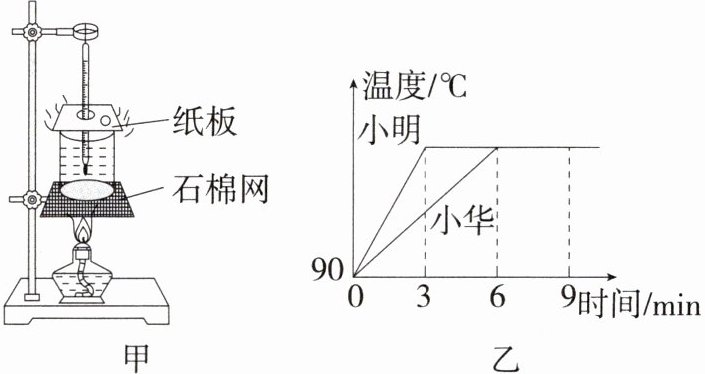 9. 「2025广东广州期中」小明和小华分别利用图甲所示的相同装置探究水沸腾时温度变化的特点,当水温达到90℃时,每隔0.5分钟记录一次温度,并绘制出了如图乙所示的水温与时间关系的图像。下列说法正确的是( )