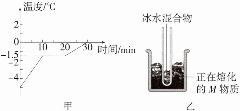 解析 由题图甲可知,1个标准大气压下,M物质熔化时不断吸热,温度保持不变,说明M物质属于晶体,其熔点为-1.5℃;加热到第15min时物质正在熔化,处于固液共存态;如题图乙所示,不考虑它们与空气的热传递,M物质熔化时的温度低于冰水混合物的温度,会从冰水混合物中吸收热量,因此试管内水的质量不会增加。