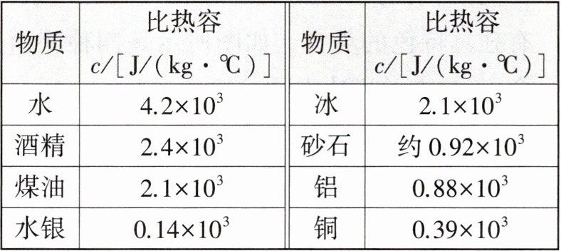 D 由表中数据可知,煤油和冰的比热容相等,故A错误;水和冰为同种物质的不同状态,两者的比热容不相等,故B错误;由$Q_{吸}=cm(t_{末}-t_{初})$可知,$t_{末}=\frac{Q_{吸}}{cm}+t_{初}$,即初温相同的物质吸收相同的热量时,物质的末温与物质的比热容以及物质的质量有关,水银和砂石的质量未知,无法比较末温的高低,故C错误;铝的比热容大于铜的比热容,由$Q_{放}=cm(t_{初}-t_{末})$可知,质量相等的铜块和铝块,降低相同的温度时,铝块放出的热量一定多,故D正确。