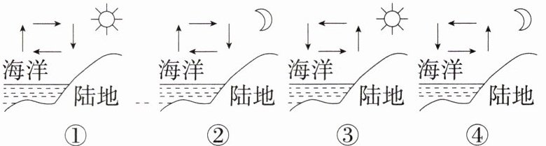 5. 跨地理 海陆风「2025江苏南通海门期中,★☆」在沿海地区炎热晴朗的天气里,陆地和海洋升温和降温的快慢不同,产生空气对流,从而形成海陆风。如图所示的四幅海陆风示意图中,对大气运动方向的判断正确的是( )