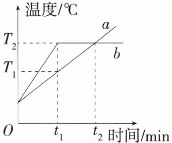 答案 大于 增加 解析 用相同的加热装置进行加热时,不计热损失,物质在相同时间内吸收的热量相同,由题图可知,加热时间为$t_{1}$时,质量和初温相同的a和b吸收相同的热量,a升高的温度较少,b升高的温度较多,由$Q_{吸}=cm(t_{末}-t_{初})$可知,物质a的比热容大于物质b的比热容;在$t_{1}\sim t_{2}$时间内,物质b持续吸热,温度不变,处于熔化阶段,其内能不断增加。