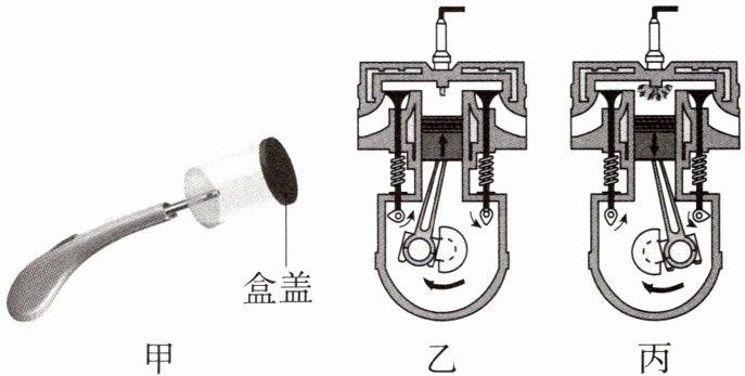 7.「2025安徽怀宁期中」如图甲所示,向盒内滴入数滴酒精,再将盒盖盖紧,然后按动电火花发生器的按钮,酒精燃烧产生高温高压气体,高温高压气体的____能转化为盒盖的____能,盒盖被顶飞。图____(选填“乙”或“丙”)的工作过程与上述过程的能量转化一致。