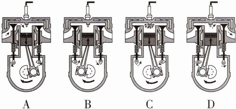 C A选项中一个气阀打开,活塞向下运动,所以为吸气冲程;B选项中两个气阀都关闭,活塞向上运动,所以为压缩冲程;C选项中两个气阀都关闭,活塞向下运动,火花塞发出电火花,所以为做功冲程;D选项中一个气阀打开,活塞向上运动,所以为排气冲程。故选C。