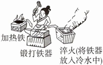 6.「2025福建龙岩月考」如图所示,将要锻打的铁器先在火炉中煅烧,然后进行锻打,再将锻打好的铁器放在水中进行淬火,以增加铁器的硬度。一个质量为2kg的锻打好的铁器毛坯,温度为700℃,淬火后它的温度降低到200℃,释放的热量中有84%被质量为10kg、初温为16℃的水吸收,求水的末温。$[c_{铁}= 0.46×10^3J/(kg·℃),c_{水}= 4.2×10^3J/(kg·℃)]$