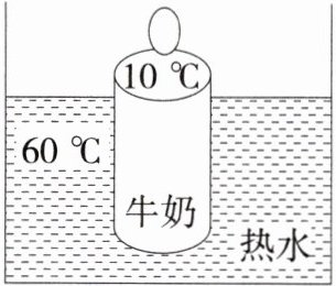 8.「2025四川遂宁船山期中」由于天气寒冷,吃早饭时妈妈要用热水给小明加热250g瓶装牛奶,如图所示,这瓶牛奶的温度由10℃最终升高到50℃,已知水的比热容为$4.2×10^3J/(kg·℃),$牛奶的比热容为$2.1×10^3J/(kg·℃),$不计热量损失,求: