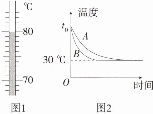 9.「2024江苏镇江中考」为比较A、B两保温杯的保温性能,小红在两个保温杯中分别倒入0.1kg相同温度的热水,用温度计测量其初温$t_{0}$,示数如图1所示,$t_{0}= $______$^{\circ }C$。绘制水温随时间的变化图像如图2所示,A杯中水放出的热量为______J,保温性能更好的是______(选填“A”或“B”)杯。[$c_{水}= 4.2×10^{3}J/(kg\cdot ^{\circ }C)$]