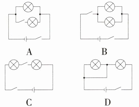 A 由实物图可知,电流从电源正极出发,经过一只开关后分为两条路径,其中一条经过灯泡后回到电源负极,第二条经过另一只灯泡和另一只开关后回到电源负极,故A符合题意。