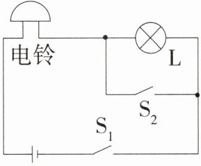 C 开关都闭合后,电流从电源正极出发,经过电铃、开关S₂、开关S₁后回到电源负极,灯泡L被短路,不会发光,但电铃仍能工作。选C。